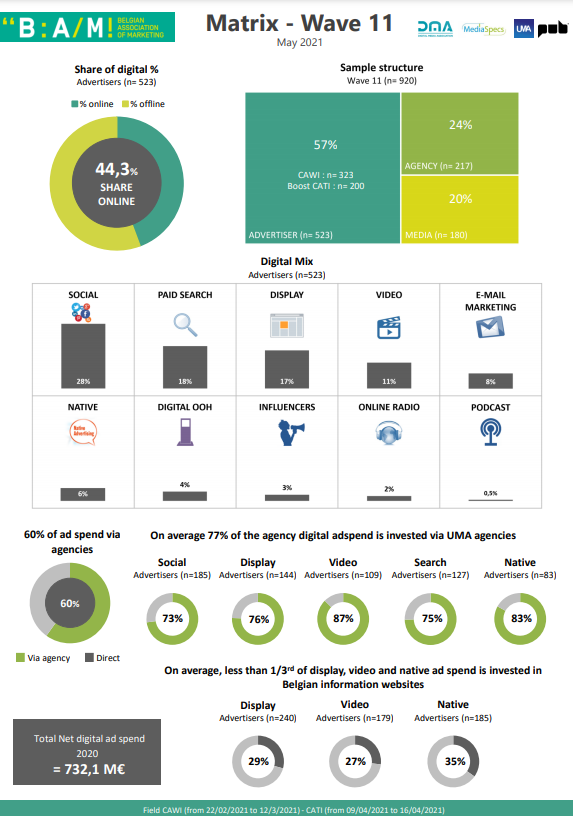 L’étude Matrix est menée par la Belgian Association of Marketing (BAM), la Digital Media Association (DMA), UMA, PUB et MediaSpecs. Elle est depuis longtemps la référence en matière d’investissements en ligne dans notre pays. Cette année, elle a interrogé un nombre record de 920 répondants. Parmi ceux-ci, plus de 500 étaient des annonceurs.