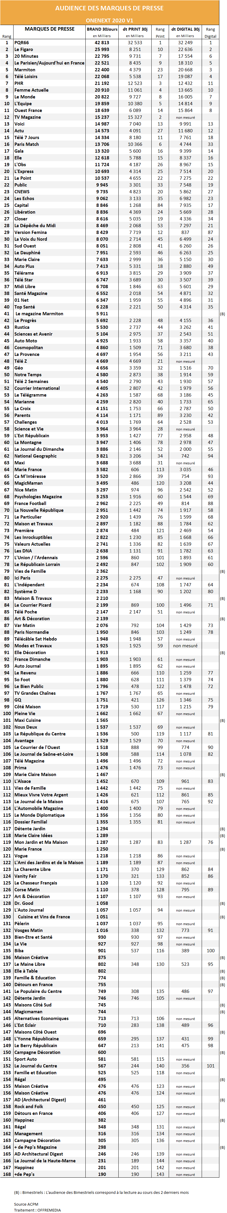 L’ACPM souligne que depuis la première étude One en 2011, les marques de presse ont en moyenne gagné 1,8 million de lecteurs ; parmi elles, 7 ont gagné plus de 5 millions de lecteurs. En 2020, 9 marques de presse ont une audience supérieure à 20 millions et 19 supérieure à 10 millions.