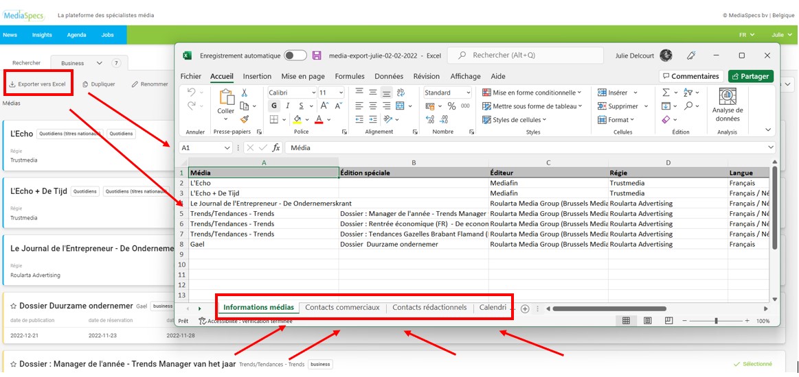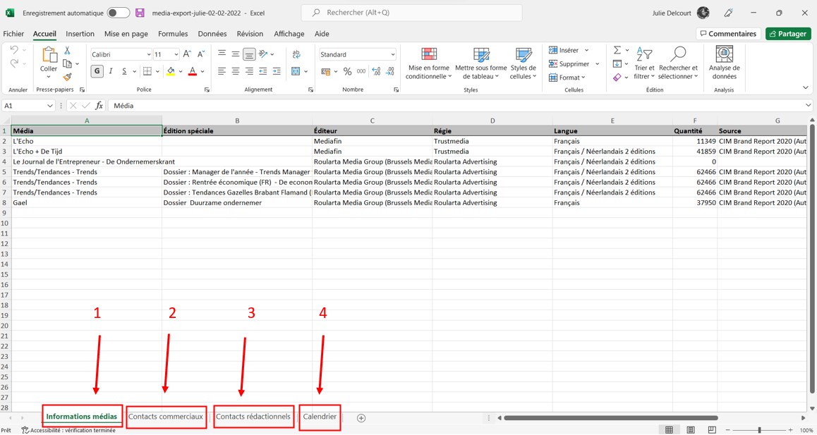 Dans les 4 feuilles de votre Excel, vous retrouvez toutes les infos nécessaires sur les médias et les éditions spéciales de votre sélection.