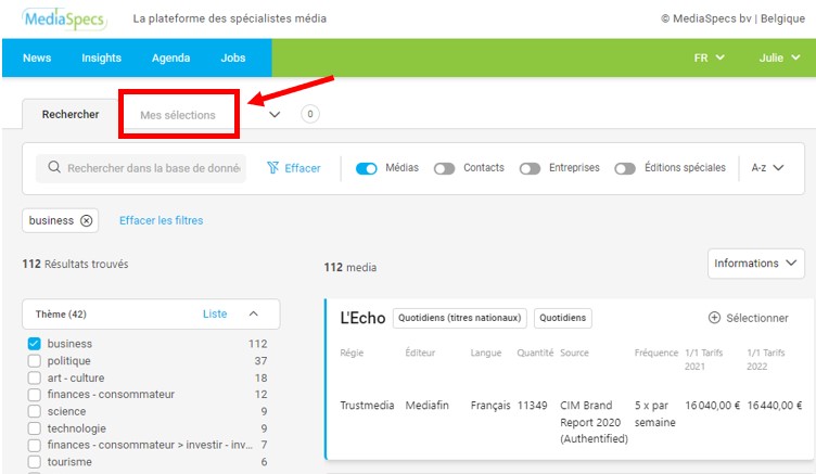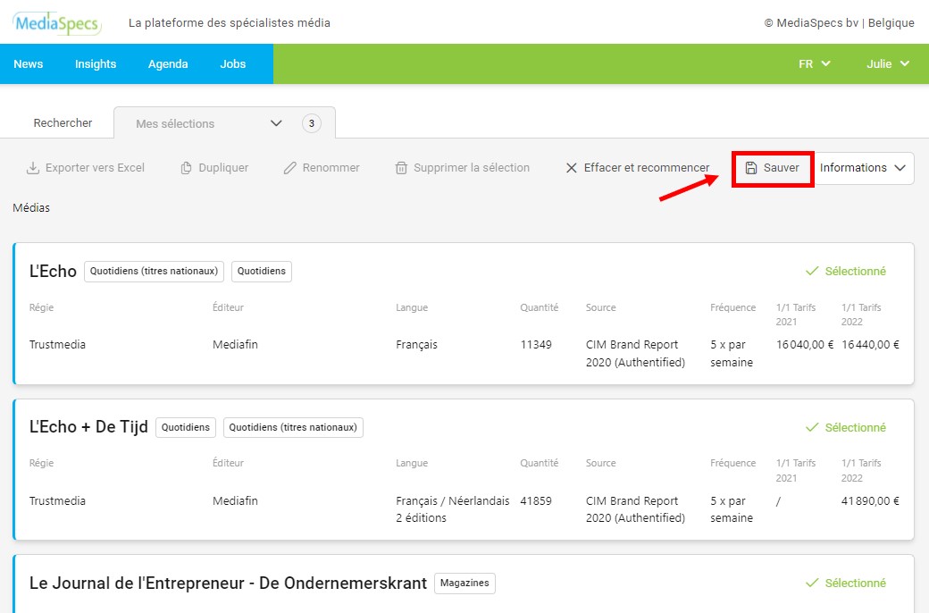 Une fois sélection faite, rendez-vous sur l’onglet “Mes sélections”. Vous pourrez cliquer sur le bouton “Sauver” votre sélection et l’enregistrer dans la base de données MediaSpecs. Lors des connexions suivantes, vos sélections enregistrées apparaîtront simplement à cet endroit.