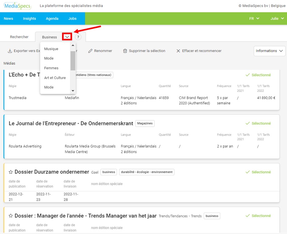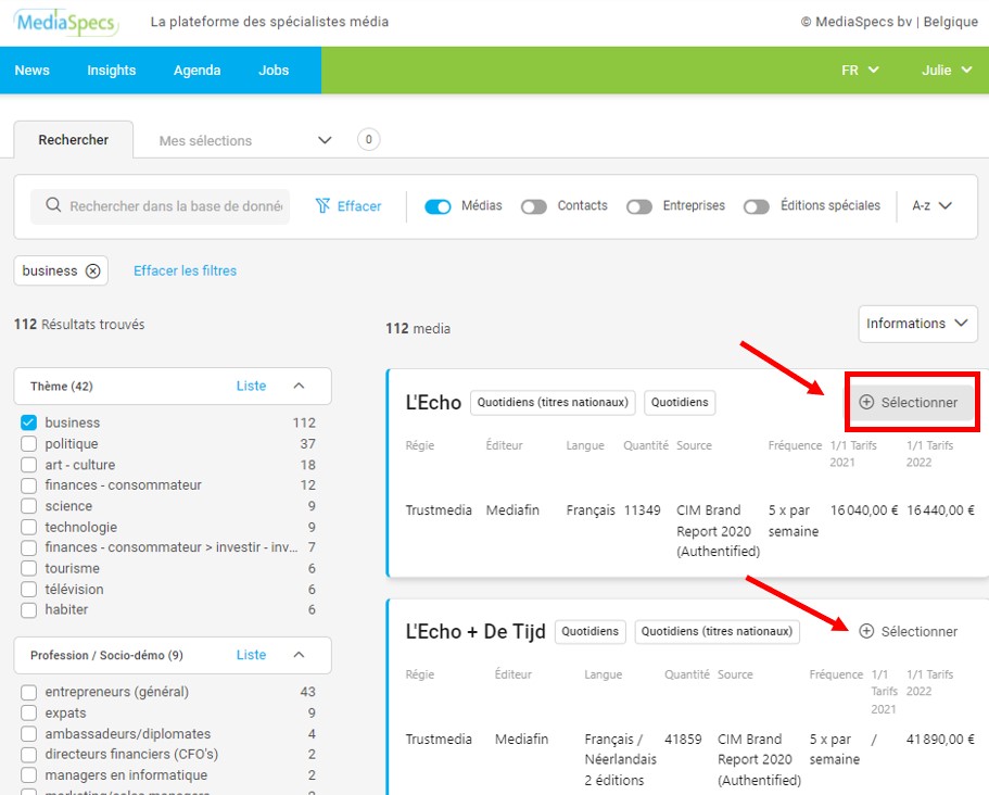 Vous pouvez sélectionner des médias et des éditions spéciales en cliquant sur le bouton “Sélectionner” qui se trouve au-dessus à droite des résultats de votre recherche individuelle.