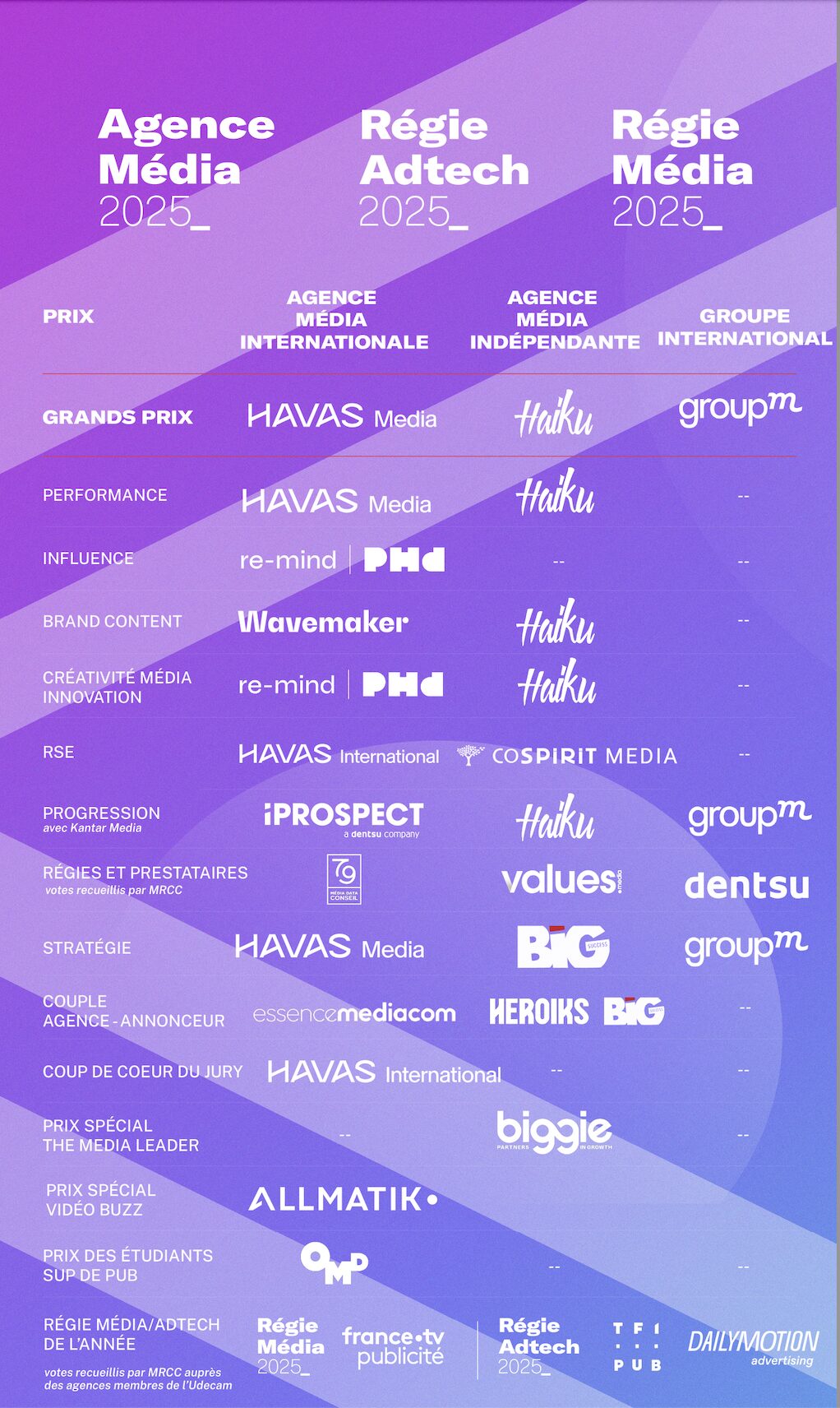 FRANCE – Agence Média de l’Année 2025 : GroupM, Havas Media et Haiku remportent les Grands Prix, les régies de France TV, TF1 et Dailymotion également récompensées