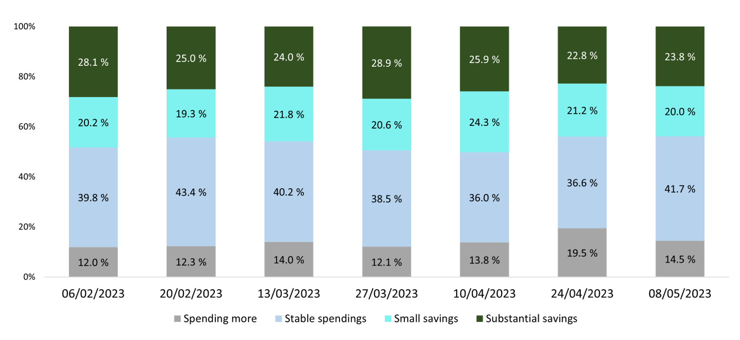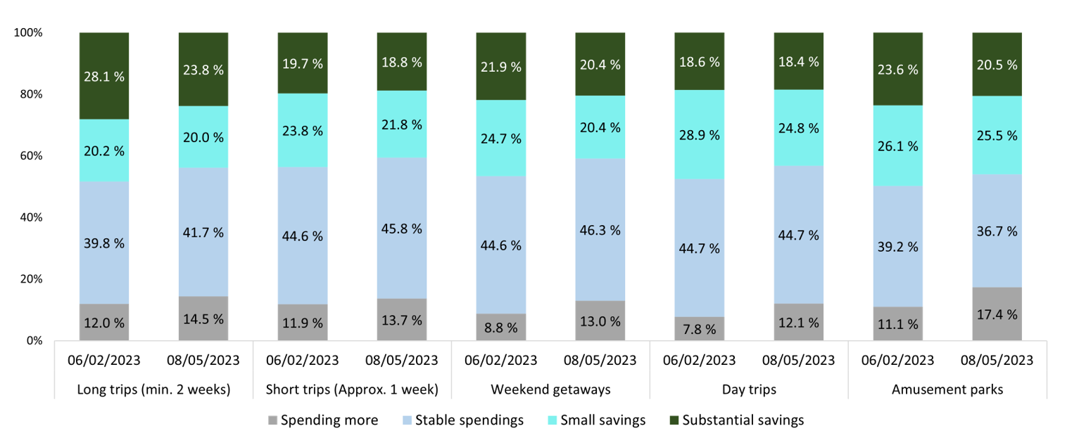 Les vacances plus courtes, d’environ une semaine, présentent une tendance similaire. Une augmentation de près de 2 points de pourcentage chez ceux qui “dépensent plus” (près de 14%). Le groupe des personnes qui font des économies importantes reste sous la barre des 20%, vague après vague. Les voyages le weekend et les excursions d’une journée gagnent jusqu’à 4 points de pourcentage entre février et mai. Ce pourcentage augmente de 6 points de pourcentage pour les visites de parcs d’attractions.