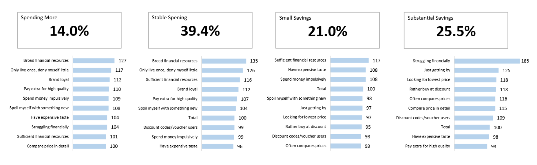 Les personnes qui déclarent faire des économies sur les longs voyages sont, sans surprise, des personnes qui ont des difficultés financières et qui doivent faire des choix difficiles et très réfléchis en matière de prix (souvent) par nécessité. Les personnes disposant de ressources financières importantes, qui profitent de l’occasion, aiment dépenser un peu plus. Les critères socio-démographiques semblent ici moins discriminants entre les deux extrêmes. C’est le contenu du portefeuille qui est déterminant. Le groupe de personnes qui tentent de contrôler leur budget sont principalement néerlandophones, âgés de 35 à 54 ans, appartenant aux groupes sociaux élevés 1 à 2. Ces personnes disposent de ressources financières importantes et aiment se faire plaisir. La population qui fait de petites économies dispose de ressources financières suffisantes. Il s’agit un peu plus souvent de jeunes de 18 à 34 ans qui se considèrent comme ayant des goûts de luxe et qui veulent donc garder leurs capacités financières. Ils déclarent être un peu plus prudents dans leurs dépenses de vacances afin de pouvoir se permettre toutes leurs autres activités.