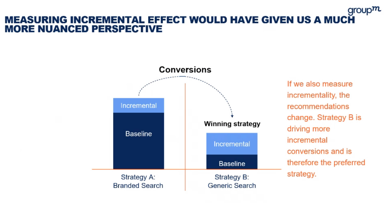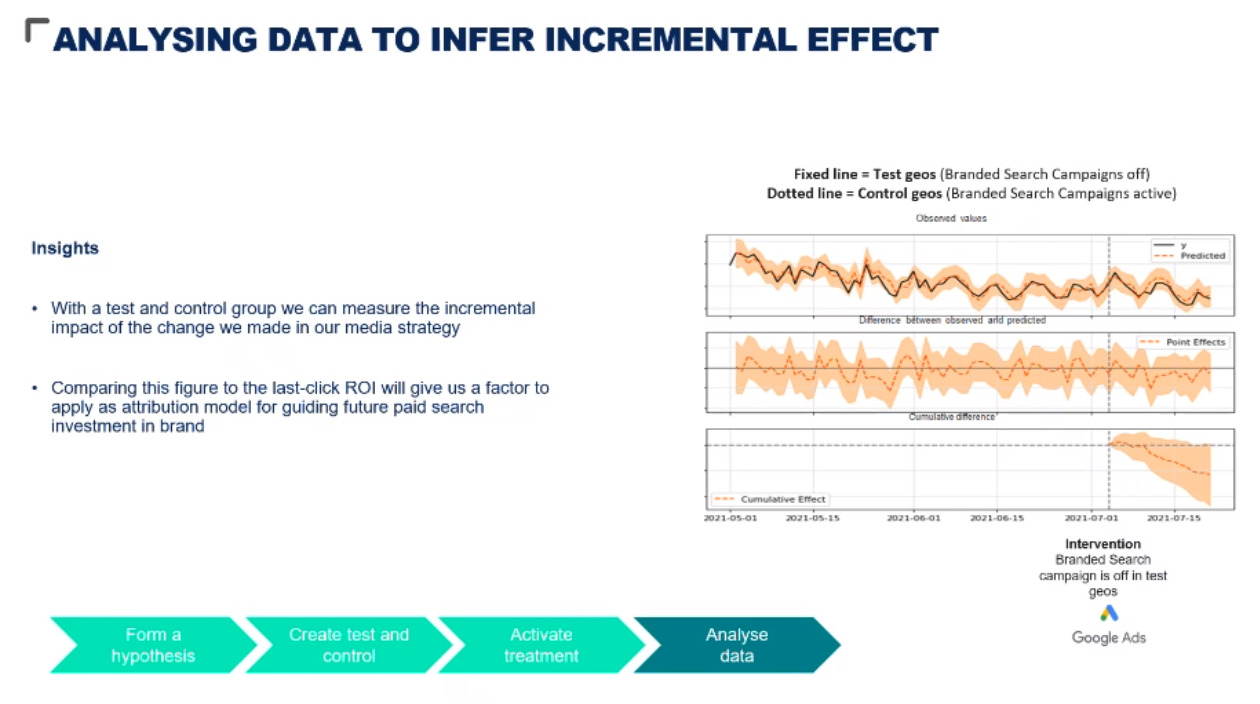 Anders Kjærbøll commence sa présentation par une déclaration importante. Il indique que les données de Google Analytics sont une source d’information très riche et continue et qu’elles permettent d’optimiser en permanence les campagnes. Cependant, il y a un grand “mais”. Les analyses ne se focalisent pas tant sur l’incrémentalité des canaux utilisés, ou ce que l’on appelle aussi la montée en puissance de l’effet. Souvent, les effets sont attribués à tort aux canaux, parce que le consommateur avait déjà prévu de visiter le site ou d’effectuer l’achat et que le canal était simplement le moyen d’y parvenir. D’où l’importance de connaître l’effet “incrémentiel” et la façon la plus simple de le faire est de mettre en place des “expériences”.