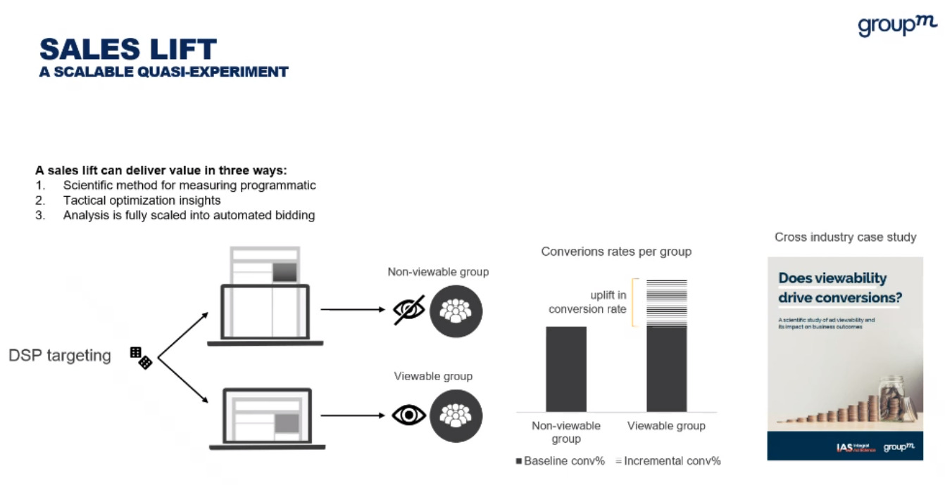 La deuxième méthode consiste à déterminer les groupes “exposés” et “non exposés” à l’aide de la viewability. Cette méthode s’appelle la méthode du Lift et, selon le KPI choisi, il peut s’agir d’un Conversion Lift ou Sales Lift. Les deux groupes correspondent à la définition du groupe cible de la campagne, mais l’un a vu l’élément de la campagne et l’autre non. En comparant les deux groupes dos à dos, on peut déterminer l’effet de la chaîne. Contrairement à l’approche GeoX, aucun canal n’est “abandonné” ici, mais le canal est évalué sur la base de sa viewability.
