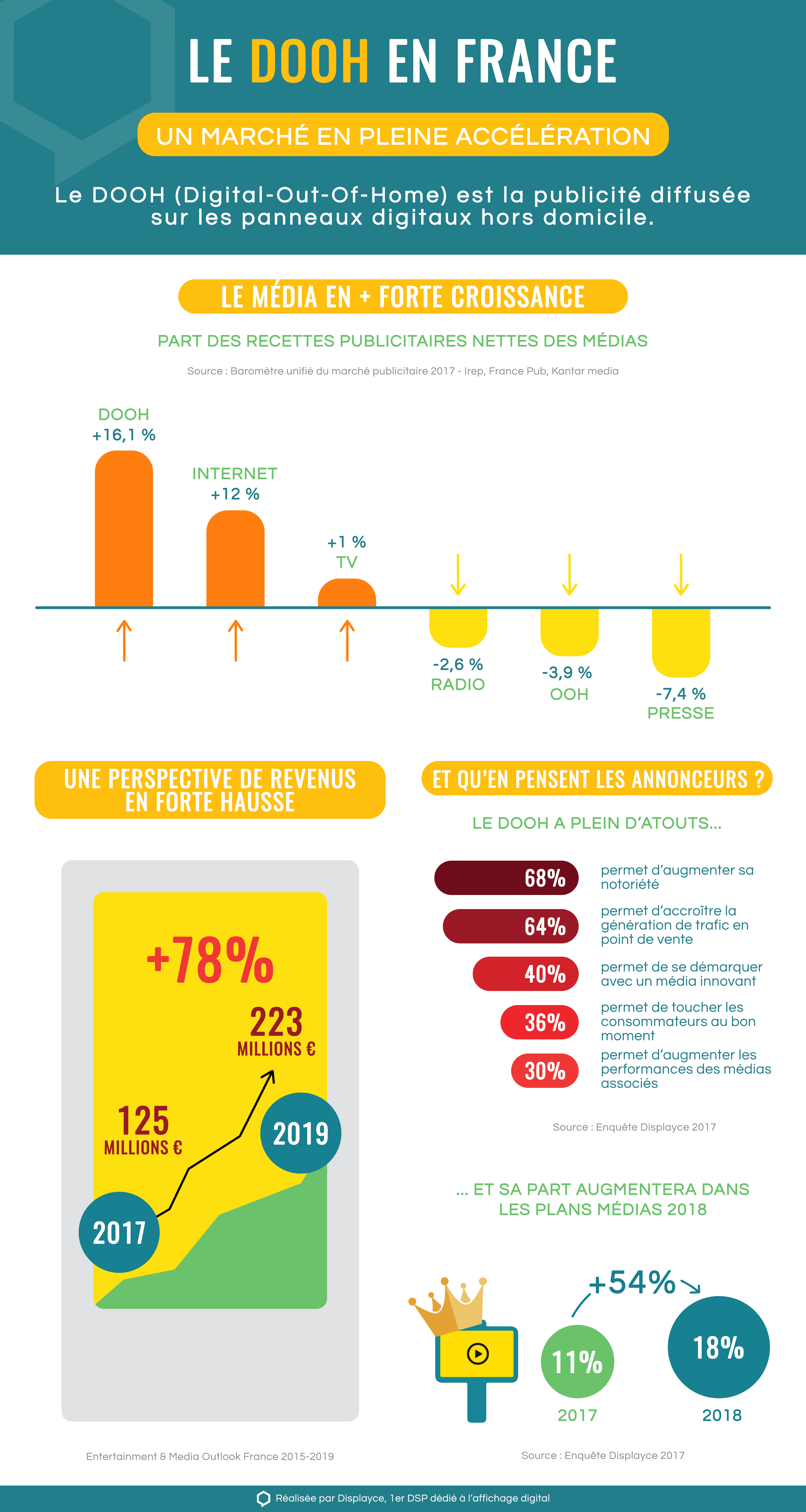 Ces quelques chiffres démontrent que le DOOH est le média avec la plus forte croissance en 2017. Il enregistre une augmentation de 16,1% de part de recettes publicitaires nettes, mais aussi des perspectives de revenus en forte hausse. Ces éléments encourageants en font un format apprécié des annonceurs qui, pour 68% d’entre eux, déclarent que le DOOH permet d’augmenter leur notoriété.