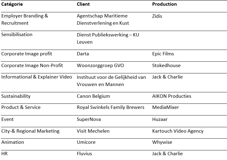 Cette année, 135 vidéos ont été soumises par des entreprises et des organisations de toute la Belgique. Ces films ont été évalués par un jury composé de dix-neuf spécialistes de la vidéo et de la communication, qui ont désigné un gagnant final dans onze catégories différentes au cours du Video Experience Day. Chaque gagnant a reçu un trophée ainsi qu’un chèque de diffusion, offert par Canal Z et Kanaal Z, d’une valeur de 4.620 euros. Inni Group a remporté le Brightfish Storytelling Award.