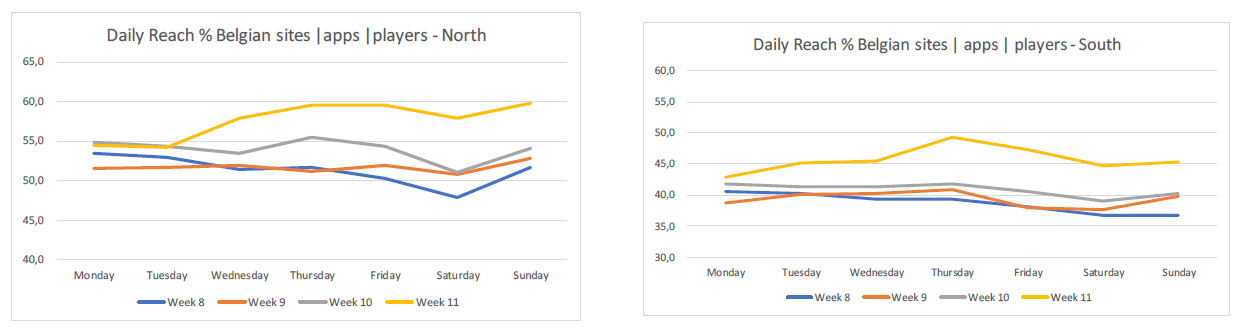 Il en va de même sur les sites, les applications et les lecteurs audio et vidéo belges mesurés par le CIM. Le pourcentage de surfeurs belges a considérablement augmenté au cours de la semaine du 9 au 15 mars, tant au Nord (jusqu’à 60%) qu’au Sud (plus de 45%).