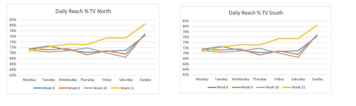 Au cours de la semaine du 9 mars, le pourcentage de Belges devant leur téléviseur est passé d’une moyenne de 70% par jour à 75% vendredi et samedi.