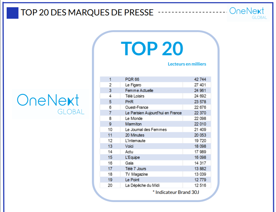 Dans le top 20 des marques de presse, nous retrouvons le trio de tête PQR 66, Le Figaro et Femme Actuelle. Ce qui n’empêche pas de belles progressions pour d’autres groupes.