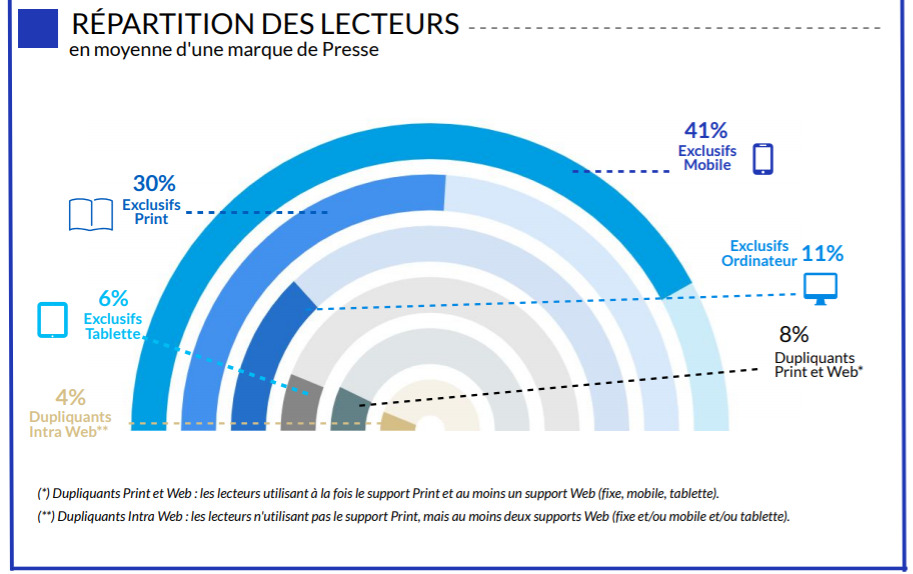95,9% des Français lisent chaque mois au moins une marque de Presse soit 50,6 millions d’individus. Les lectures de la Presse en version digitale représentent plus de deux tiers des lectures des marques de Presse (72%). Le mobile est aujourd’hui le support le plus utilisé (48%), suivi par la version papier (28%), devant l’ordinateur (15%) et la tablette (9%). Chaque mois, 81,6% des des Français, lisent au moins une marque de Presse en version digitale (ordinateur, mobile ou tablette), soit 43 millions d’individus.