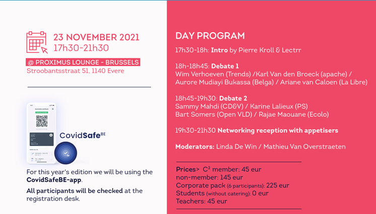 L’événement débutera à 17h30 et s’achèvera à 19h30. Il sera suivi d’une réception jusqu’à 21h30 au Proximus Lounge à Bruxelles. Consultez notre agenda et le site du C² pour plus d’informations.
