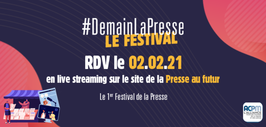#DemainLaPresse le Festival, c’est l’événement à destination de tout l’écosystème de la presse. Il se déroulera en live-stream sur le site de La Presse au Futur, le 2 février prochain de 10h à 18h30 et rassemblera les plus grands acteurs du monde de la presse : agences, éditeurs, régies et annonceurs ainsi que les éditorialistes, journalistes, rédacteurs en chef, etc.