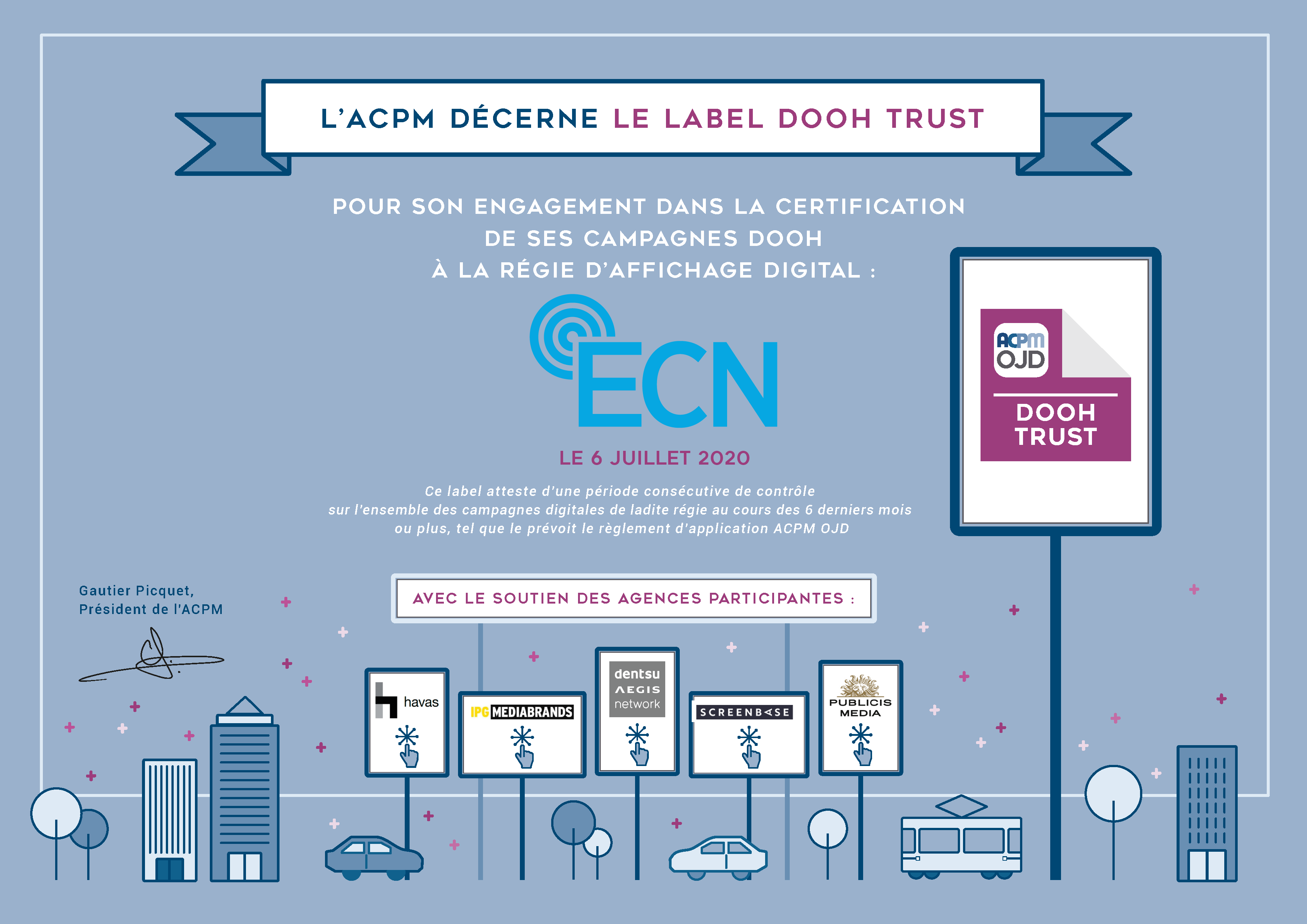 Le label DOOH Trust récompense les entreprises de communication extérieure digitale – DOOH – dont les campagnes sont soumises aux règles de contrôle de l’ACPM/OJD. Avec ce Label, l’ACPM a pour mission d’assurer le contrôle de la diffusion des campagnes DOOH, marché représentant 32 Millions d’Euros sur le 1er trimestre 2020.