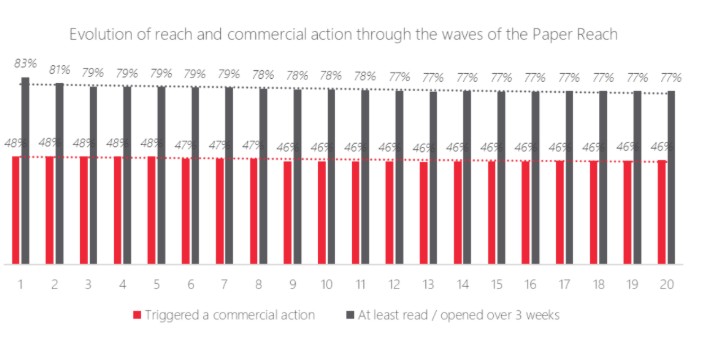 Dans un contexte où la publicité en ligne rencontre des défis croissants (ad-blocking, fragmentation des audiences, hausse des coûts d’acquisition), le Paper Mail maintient des performances solides et continues à travers les différentes vagues d’études.