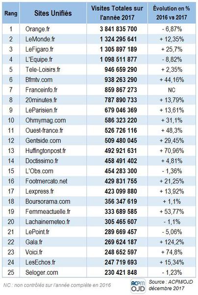En ce début d’année 2018, l’ACPM publie un classement des 25 sites les plus visités en 2017 et les classements des fréquentations fixes et mobiles sur décembre 2017.