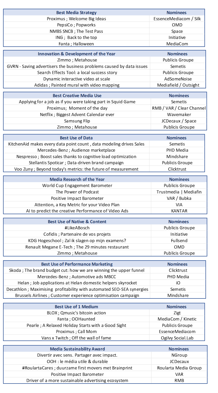 Après tout, l’attribution des AMMA se déroule en deux étapes. Par exemple, les fichiers dans les catégories « Meilleure stratégie média », « Meilleure utilisation créative des médias », « Meilleure utilisation du marketing à la performance », « Innovation et développement de l’année », « Recherche média de l’année », « Meilleure utilisation de data », « Best Use of Native & Content », « Best Use of 1 Medium » et « Media Sustainability Award » ont été minutieusement examinés lors de neuf sessions de jury différentes d’un groupe d’experts qui sélectionnent 5 fichiers par catégorie et les envoient au jury final.