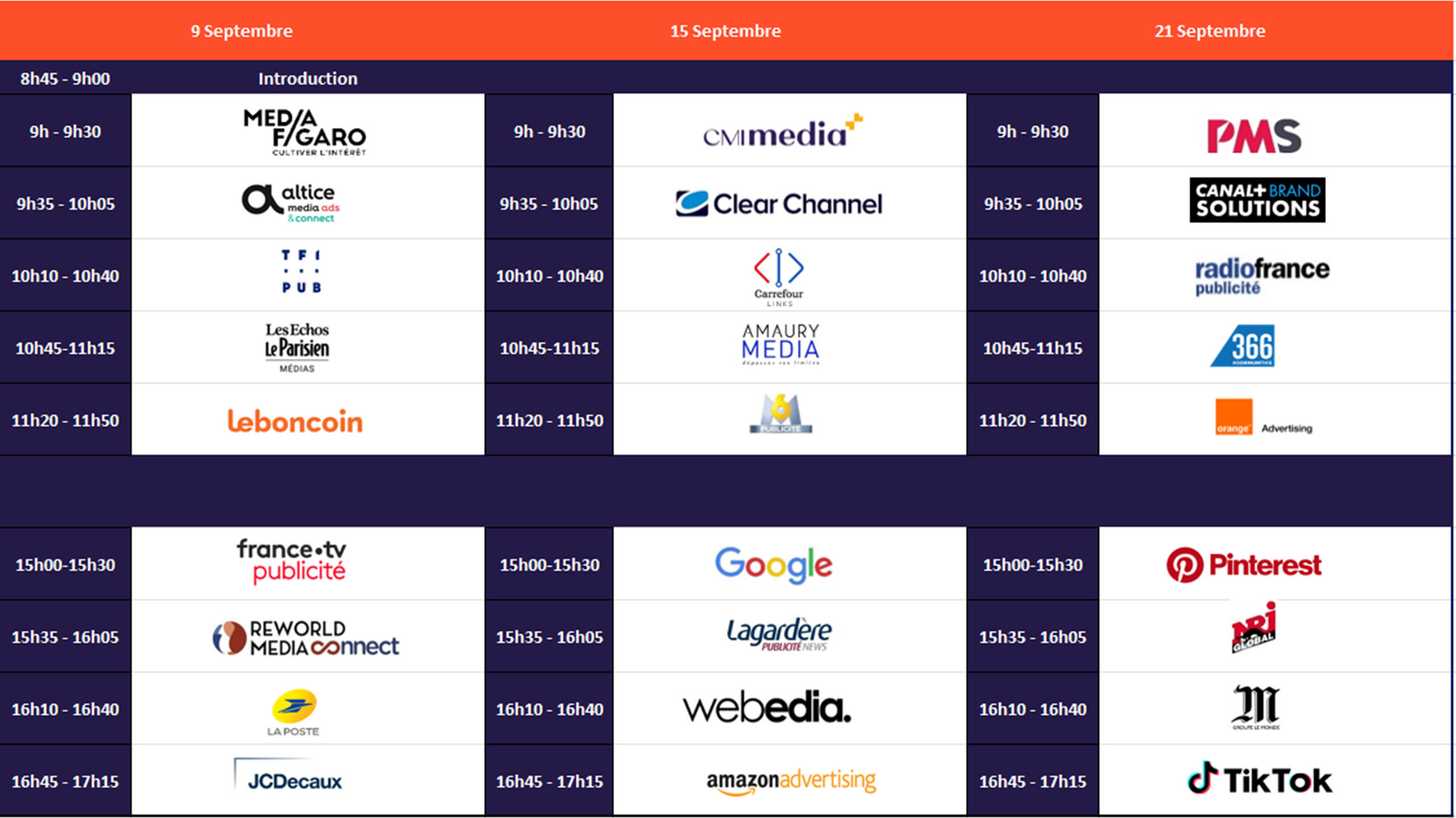 Diffusées en live depuis l’Union des marques avec l’aide des équipes d’Offremedia et du soutien de l’UDECAM, ces Rencontres Médias animées par Benoît Régent de Dentsu, accueilleront durant trois journées (9, 15 et 21 septembre) patrons de groupes médias, de régies et de plateformes sélectionnés par la Média Team de l’Union des marques. Ils interviendront dans un format de 30 min (20 min de présentation, 10 min de questions/réponses) selon un planning prochainement disponible, devant annonceurs et agences confortablement installés devant leur écran.