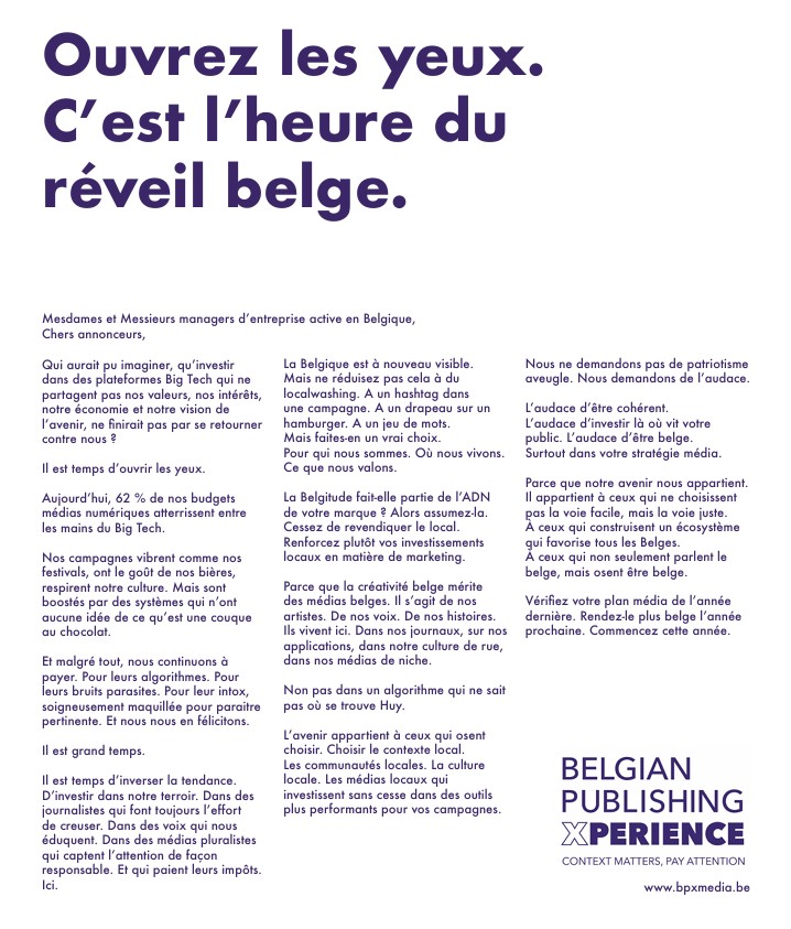 BPX appelle à ne plus participer au “localwashing”, à savoir la revendication superficielle d’une identité belge dans les campagnes publicitaires sans investissement local. Ils encouragent, à l’inverse, un choix conscient et structurel en faveur des médias qui contribuent à notre démocratie, notre journalisme, notre culture et à notre économie.