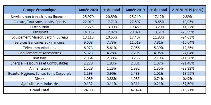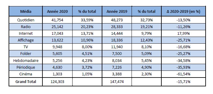 D’un point de vue résultats, les investissements publicitaires commerciaux bruts au Grand-Duché de Luxembourg se sont élevés au cours de l’année 2020 à 124,303 millions euros, ce qui constitue, à périmètre constant, une baisse de 15,7% ou 23,2 millions d’euros à l’année 2019 (147,474 millions). Ces chiffres prennent en considération les investissements publicitaires commerciaux au Luxembourg et couvrent les types de médias suivants : quotidiens, hebdomadaires, périodiques, radios, TV, Internet, affichage, cinémas et folders.