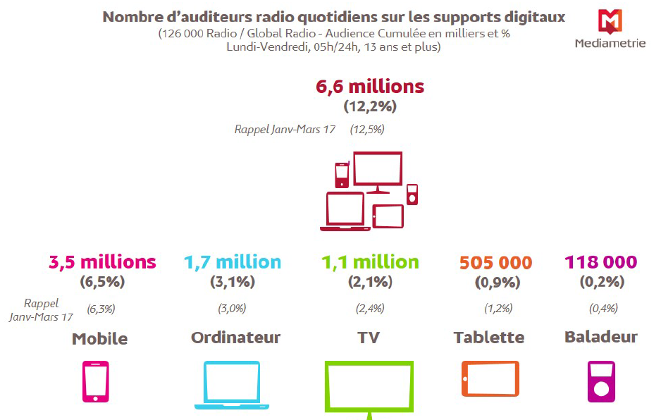 Le téléphone mobile continue sa progression et reste le premier support numérique utilisé pour écouter la radio avec 3,5 millions d’adeptes chaque jour. Viennent ensuite l’ordinateur (1,7million d’auditeurs), la télévision (1,1million), la tablette (505 000) et le baladeur (118 000).