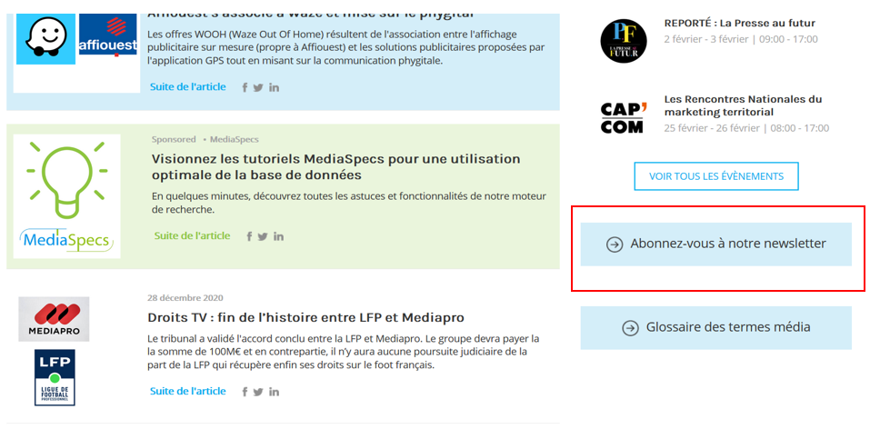 Comme vous le savez, MediaSpecs est la base de données de tous les médias publicitaires en France. Mais, en plus de ce service, nous vous tenons informé des dernières actualités du secteur médiatique grâce aux articles que nous publions sur notre site web.