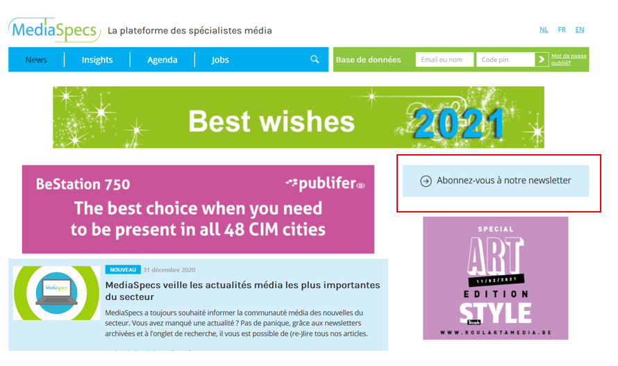 Comme vous le savez, MediaSpecs est la base de données trilingue de tous les médias publicitaires en Belgique et au Luxembourg. Mais, en plus de ce service, nous vous tenons informé des dernières actualités du secteur médiatique grâce aux articles que nous publions sur notre site web.