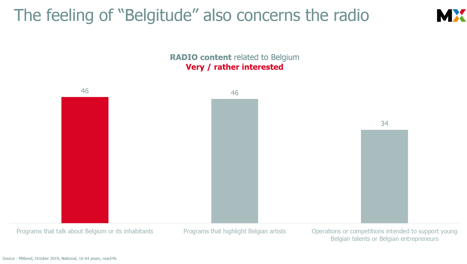 Dans MXtend, les programmes belges testés en radio sont moins nombreux que ceux testés en télévision. Cela explique en partie le taux d’intérêt global de 57% (contre 78% pour la TV) pour les contenus audio tout spécialement orientés sur la Belgique. Entre les 3 types d’émissions analysées, les programmes axés sur la Belgique ou ses habitants se retrouvent en tête de peloton avec un intérêt déclaré par 46% des personnes interrogées.