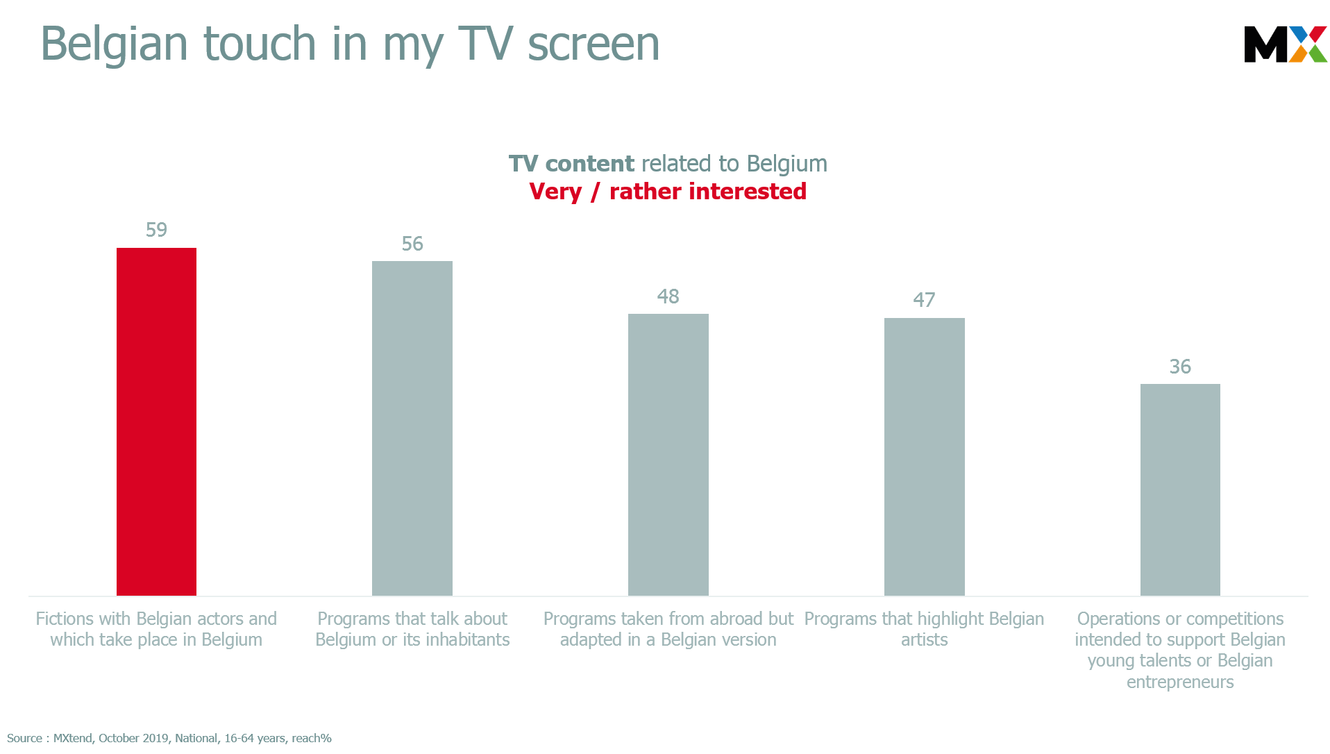 Les insights tirés de MXtend démontrent que les offres à ancrage local occupent une place majeure dans les attentes des consommateurs média belges. Audience, mais aussi surtout implication et engagement, constituent les forces des propositions de contenus typiquement belges.