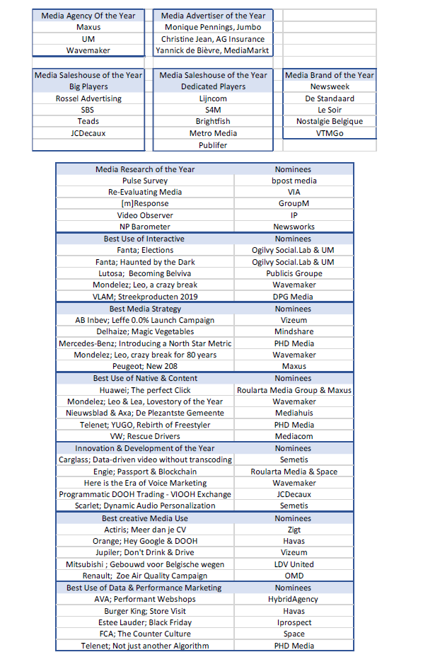 In de categorie Media Agency of the Year zijn genomineerd: Maxus, de winnaar van vorig jaar, Wavemaker en UM.