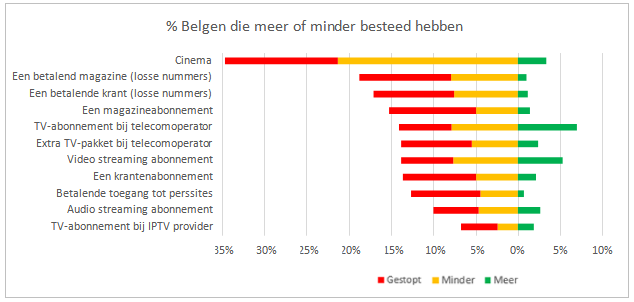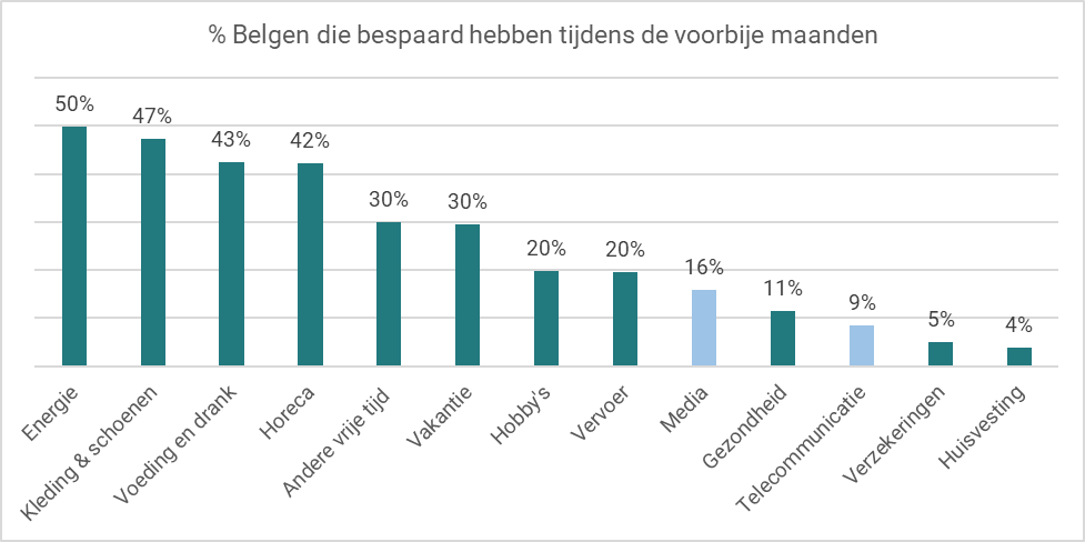 Uit dit onderzoek blijkt dat de media en telecommunicatie relatief gespaard blijven: 16% van de Belgen zegt te hebben bespaard in de media en slechts 9% in de telecommunicatie. Het lijkt alsof deze sectoren als noodzakelijk worden gezien. Of misschien zijn de budgetten te klein om relevante besparingen te realiseren?