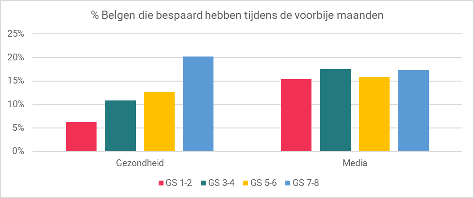 Als we inzoomen op profielen, blijkt logischerwijze dat de hoogste sociale groepen (1 en 2) over het algemeen minder getroffen worden door de crisis. Een analyse op sectorniveau toont niettemin dat de verschillen tussen sociale groepen sterk afhangen van de sector: in de laagste sociale groepen wordt beduidend meer bezuinigd op gezondheidszorg (zie hieronder) of verzekeringen. Besparingen op media zijn veel ‘neutraler’ in termen van sociale groepen (zie hieronder).