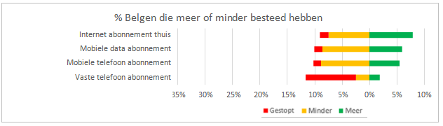 De telecomsector doorstaat de crisis vrij goed. Natuurlijk zet de trend om vaste telefoonlijnen op te zeggen zich door, als hij niet nog versnelt: 9% van de respondenten zegt dat ze de afgelopen maanden hun vaste lijn hebben opgezegd. Sommigen zijn ook op zoek gegaan naar goedkopere abonnementen. Maar slechts 1% heeft zijn data-abonnement stopgezet, 1% zijn mobiele telefoonabonnement en 2% zijn internetabonnement thuis. Connectiviteit is een noodzaak geworden voor de Belgen.