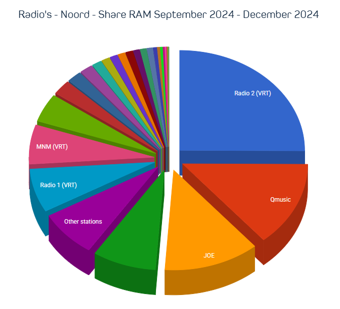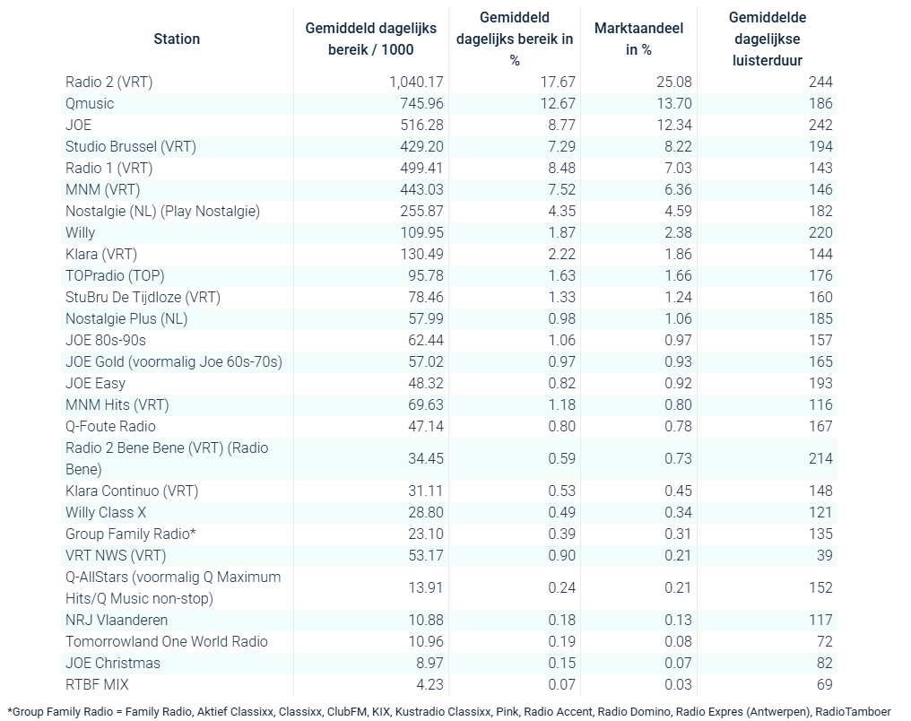 Radio2 blijft met een marktaandeel van ruim 25,08% de grootste in Vlaanderen, gevolg door Qmusic (13,70%) en JOE (12,34%).