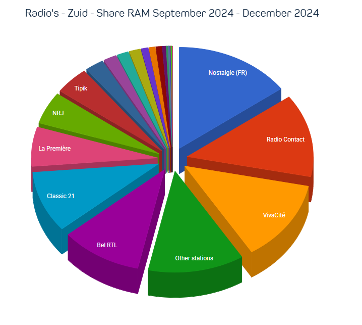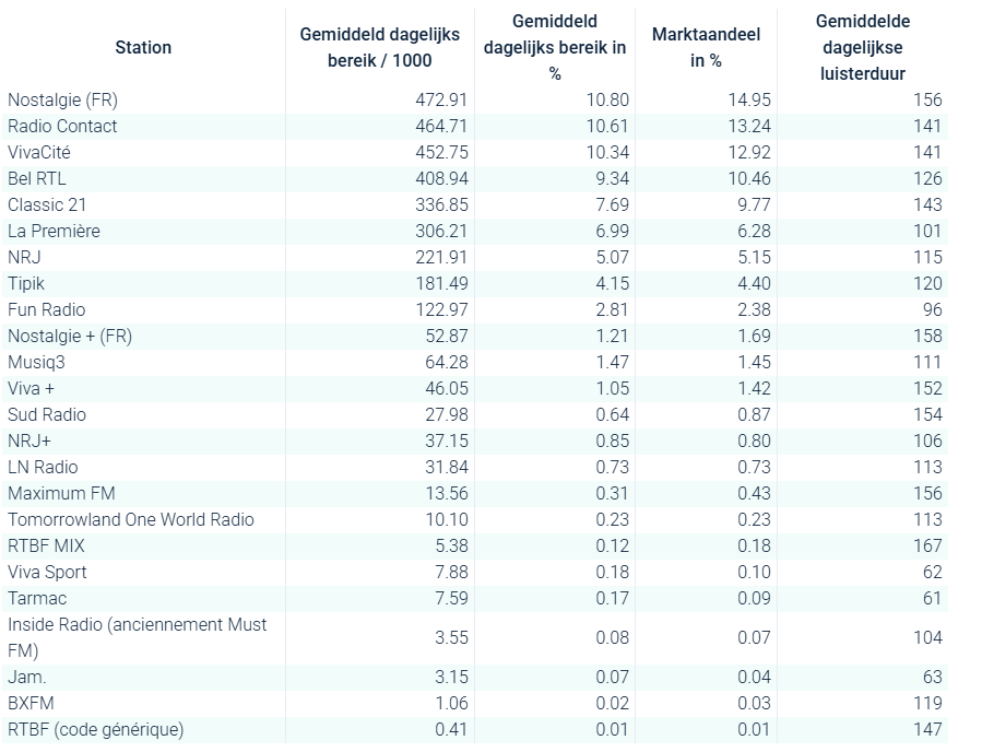 In Franstalig België zijn de drie grootste radio’s Nostalgie (14,92%) Radio Contact (13,24%) en VivaCité (12,92%).