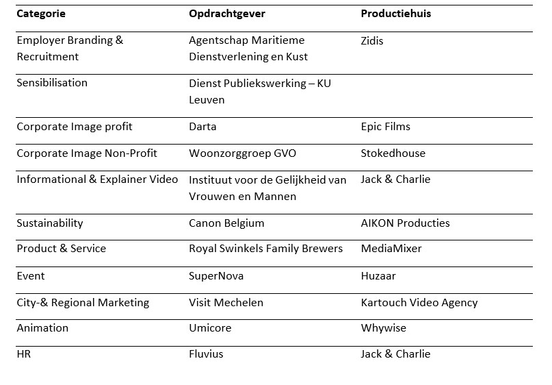 Hieronder vindt u een overzicht van de winnende corporate video’s. Alle winnende inzendingen zijn hier te bekijken.