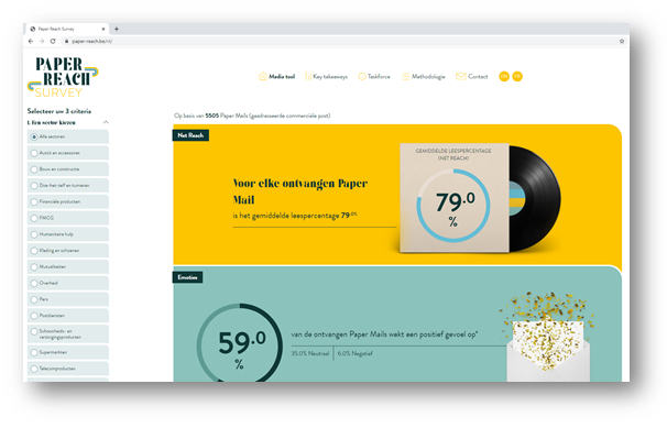 Deze studie had niet enkel tot doel om een nieuwe referentiemeting te creëren voor Paper Mail, maar ook om het adverteerders en agentschappen makkelijker te maken de impact van hun Paper Mail-campagnes beter in te schatten. Daarom werd een online mediatool ontwikkeld. Hiermee krijgt u gratis en gemakkelijk toegang tot alle bovenvermelde gegevens, maar kan u vooral een deepdive doen in de resultaten op vlak van sector en specifiek doelpubliek.