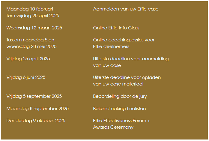 Cases kunnen tem vrijdag 25 april digitaal aangemeld worden. U kunt het materiaal voor uw case nadien opladen en kiezen uit 3 deadlines met bijhorende tarieven. Raadpleeg zeker de Effie Entry Kit 2025.