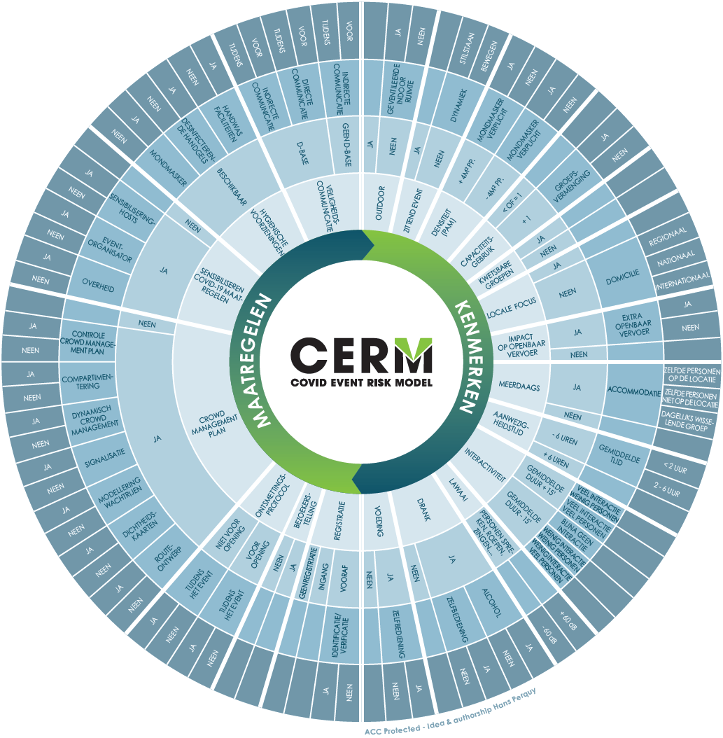 Om het publiek vanaf 1 juli opnieuw zo veilig als mogelijk te kunnen verwelkomen op een gecontroleerde en gefaseerde wijze, heeft de eventsector in samenwerking met de overheid en wetenschappers het Covid Event Risk Model (CERM) ontwikkeld. Het model kreeg de goedkeuring van de GEES en is van toepassing voor toeristische, sportieve, culturele en corporate events in Vlaanderen, Wallonië en Brussel. Het wordt ondersteund door alle lokale, regionale en federale autoriteiten.