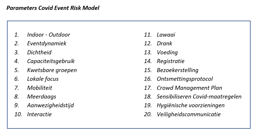 “Het veiligheidsrisico is gebaseerd op 20 parameters waarvan geweten is dat ze de verspreiding van het coronavirus verkleinen of net verhogen”, aldus Hans Perquy. De vragenlijst behandelt deze parameters een voor een via voornamelijk ja/nee-vragen. De organisator geeft per parameter aan wat van toepassing is op zijn event. Enkele voorbeeldparameters: “Afstand en interactie hebben een invloed op het besmettingsrisico, outdoor is veiliger dan indoor. Maar dit wil niet zeggen dat indoor events daarom niet kunnen of mogen doorgaan. Een goede ventilatie van de indoor locatie kan immers ook het veiligheidsrisico beperken”.