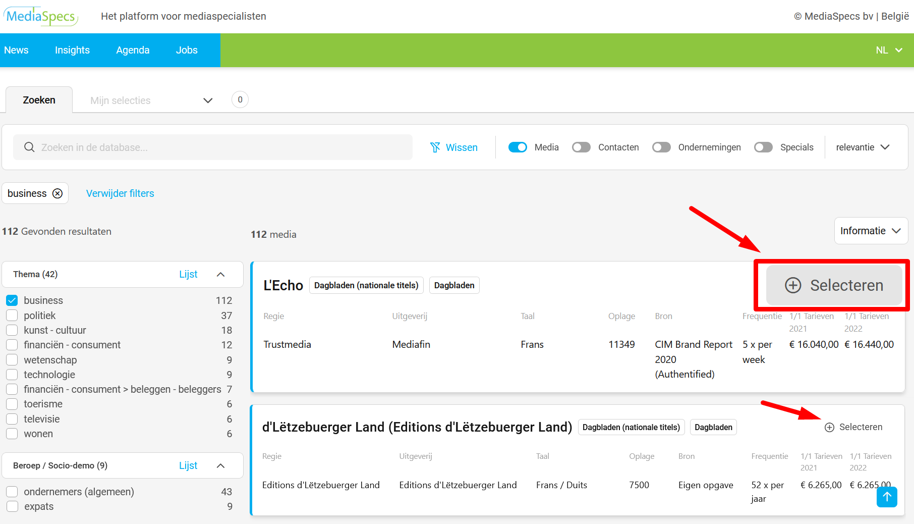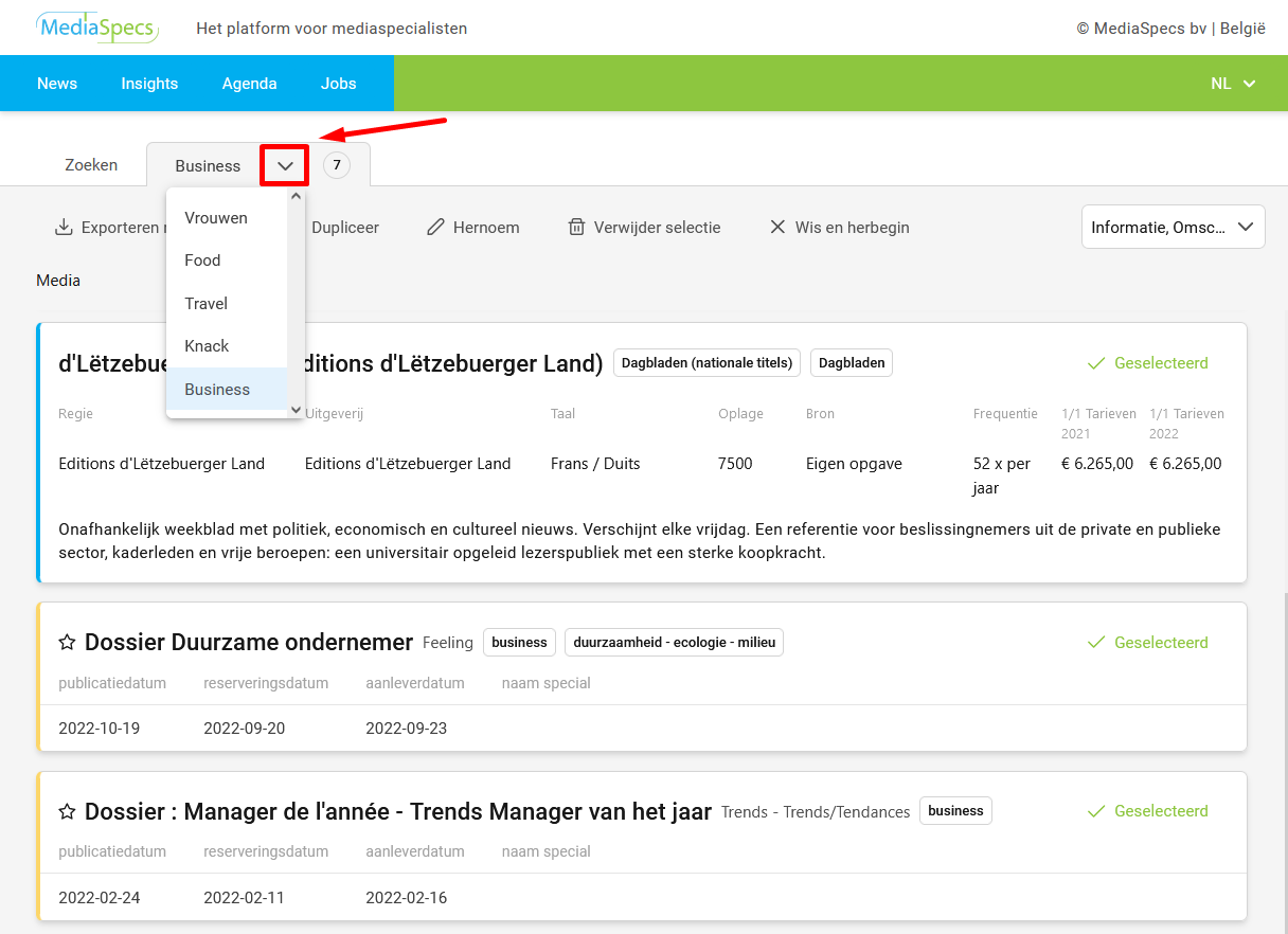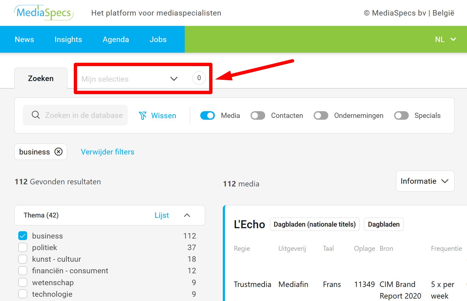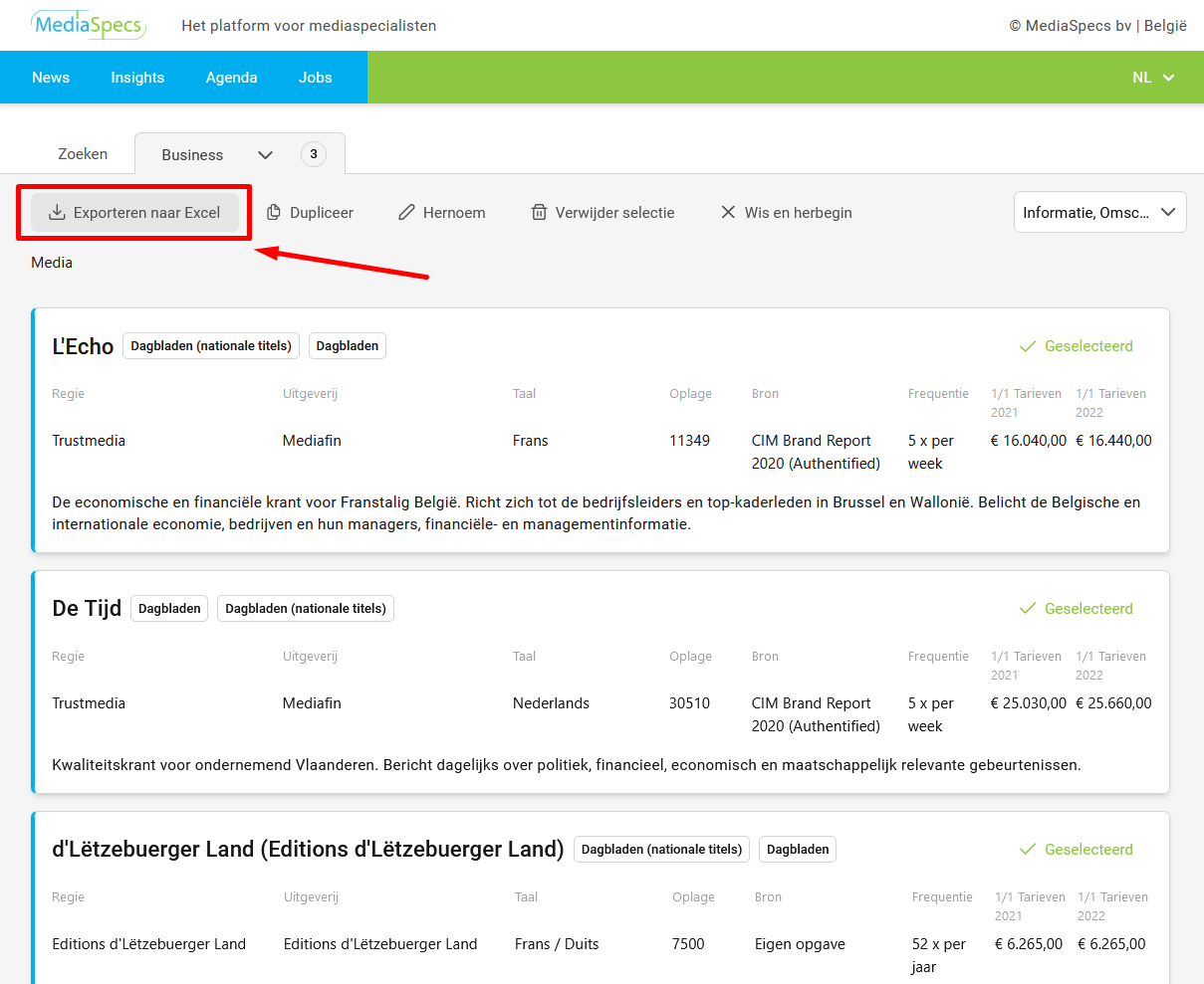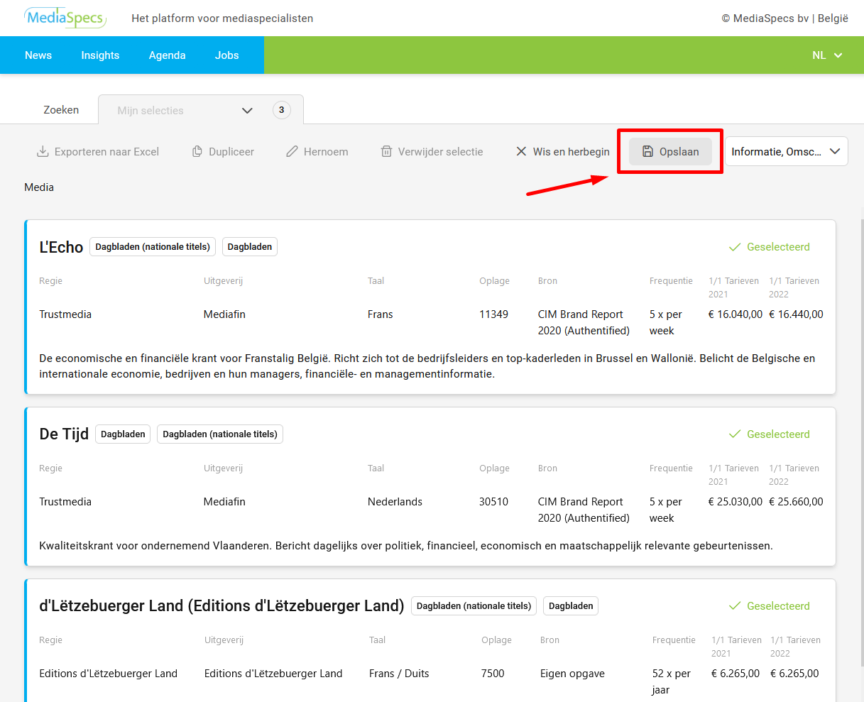 Eenmaal een selectie gemaakt, gaat u naar het tabblad ‘Mijn selecties’. Daar kan u via de knop ‘Opslaan’ uw selectie opslaan en bewaren in de MediaSpecs Database. Bij volgende logins vindt u uw bewaarde selecties daar gewoon terug.