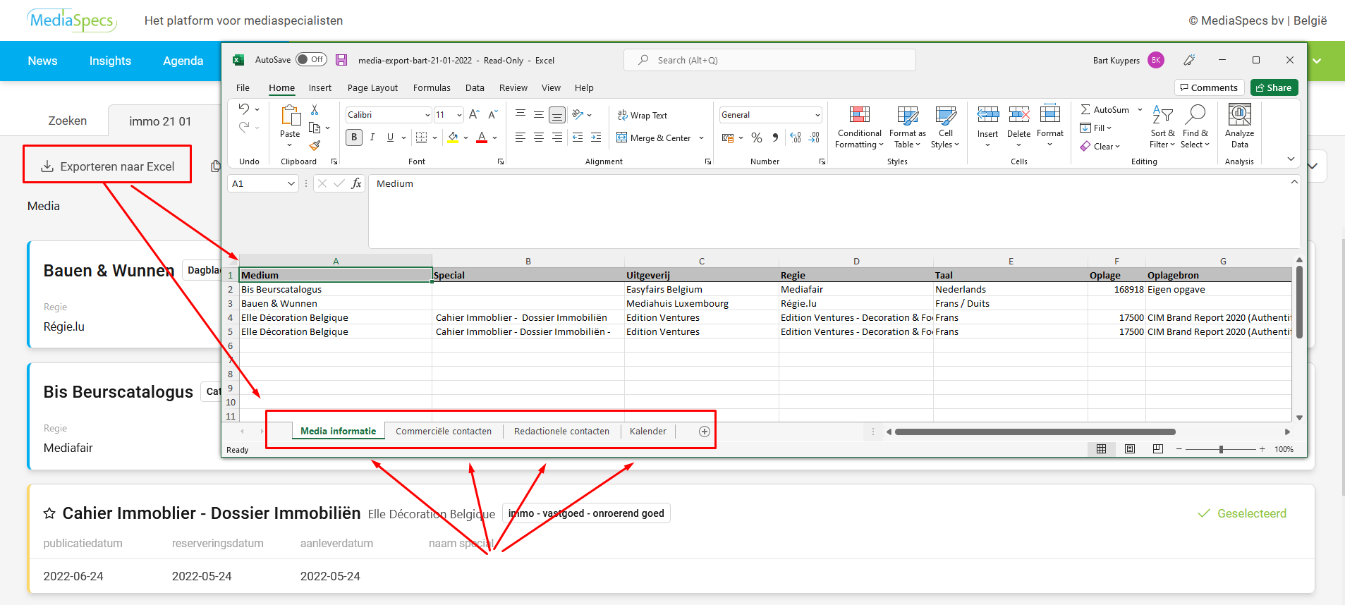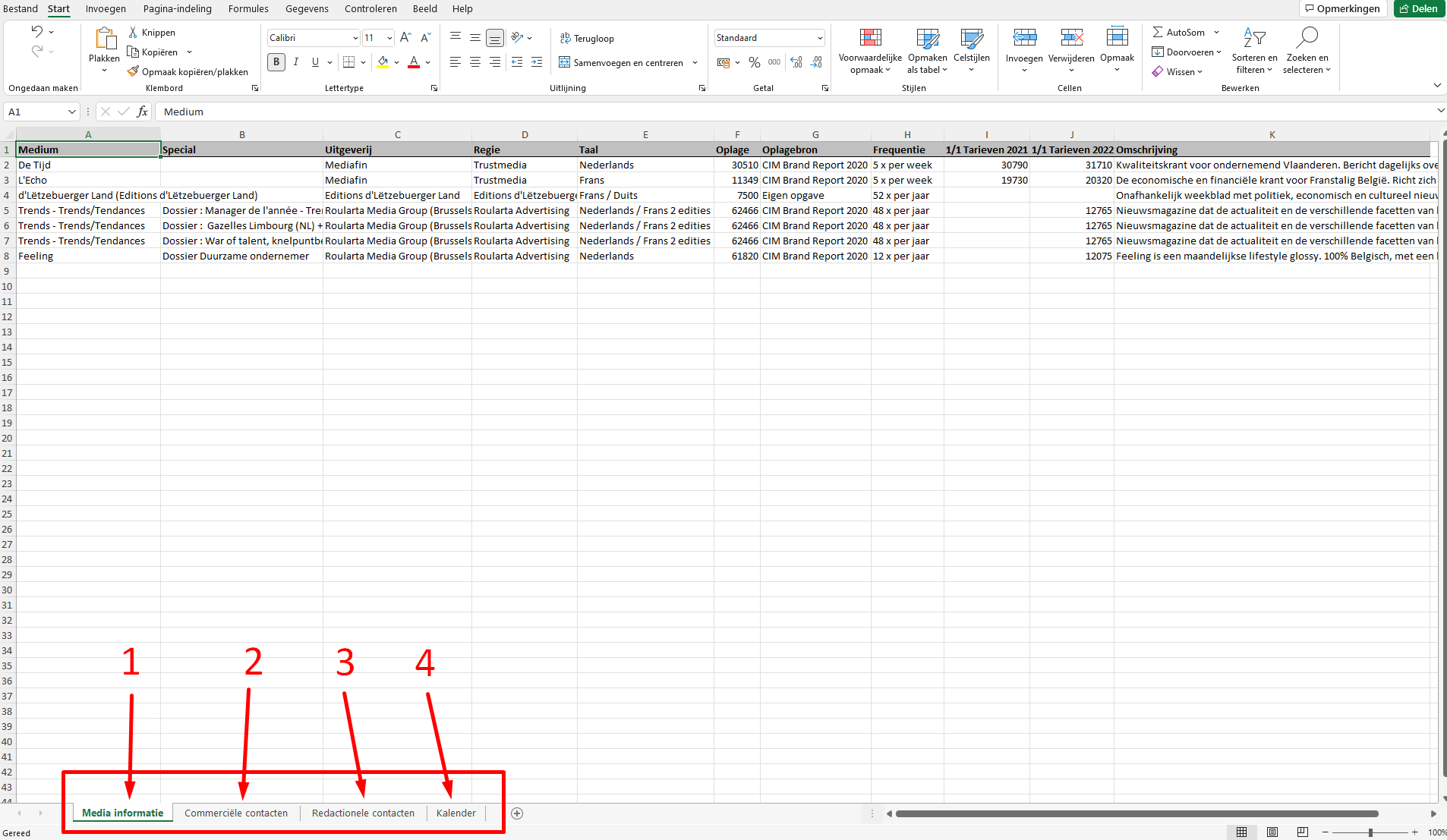 In 4 tabbladen in Excel vindt u zo de nodige info terug over de media en specials in uw selectie.