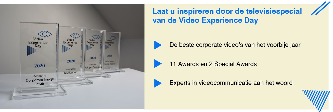Op 9 juni zendt Kanaal Z / Canal Z om 18 uur de 21ste editie van de Video Experience Day uit. Tijdens de tv-special onderzoeken we waarin precies de kracht van een goede bedrijfsfilm schuilt. Ook bekroont een jury van experts de beste corporate video’s in elf verschillende categorieën en reikt ze twee Special Awards uit. Ben je benieuwd naar hoe je met corporate video ook jouw bedrijf een meerwaarde biedt? Ontdek het tijdens de Video Experience Day op Kanaal Z / Canal Z! Voor meer info, surf naar www.videoexperienceday.be. Leuk om te weten is dat de tv-special ook nog driemaal per dag wordt heruitgezonden op 10, 11 en 12 juni. Tijdens het weekend van 13 juni volgt een cocktailreportage.