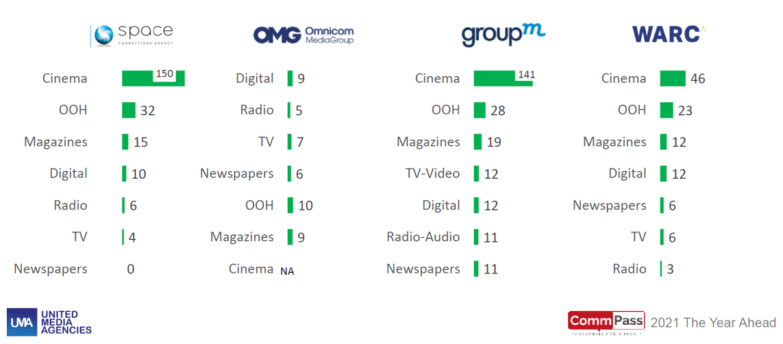Welke vorm zal het herstel aannemen?” vraagt Bernard Cools zich af. “Volgens de WARC zal 2021 ten opzichte van 2020 over de hele lijn een positieve trend aannemen. Voor België hebben we overal positieve cijfers, maar afhankelijk van de bronnen zijn die cijfers meer of minder positief. Wat betreft de media is er nog steeds een consensus over cinema. Die zou de grootste correctie van 2021 moeten meemaken.