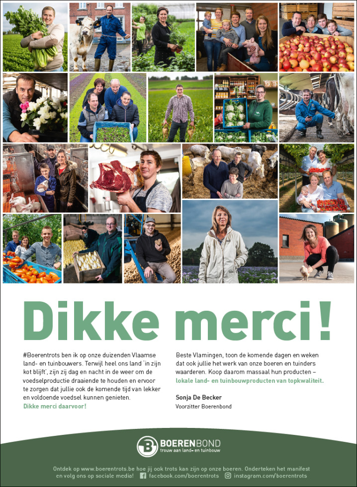 “Met producten komt iedereen genoeg in contact, maar veel mensen beseffen niet dat er achter die producten ook mensen van vlees en bloed zitten die dagelijks enorm hard werken. Boerenbond was lang een meester in reactieve communicatie, maar anno 2020 willen we ook proactief communiceren. Door mee te werken aan initiatieven zoals #Boerentrots en Boerenjaar willen we ook een blik achter de schermen bieden hoe het er in werkelijkheid aan toegaat.”