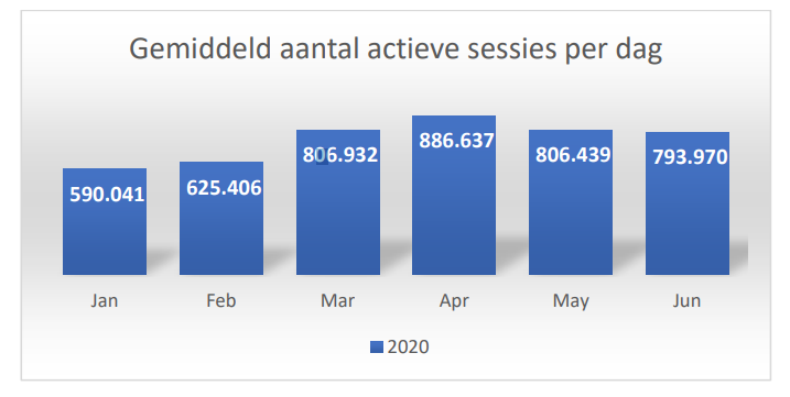 Onderstaande grafiek toont de evolutie van online radio in België op basis van het dagelijks aantal opgevraagde radio streams (het aantal “actieve sessies”).