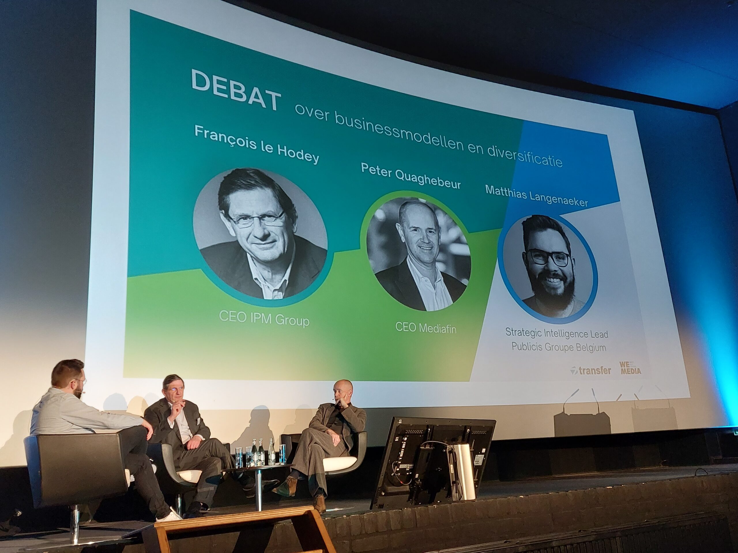 Na de keynote van Pascal Chevalier (Reworld Media) tijdens Media & Communities, het seminarie ter ere van 15 jaar MediaSpecs, gingen Peter Quaghebeur (CEO van Mediafin) en François le Hodey (CEO van IPM Group) met elkaar in gesprek. Onder leiding van moderator Matthias Langenaeker (Strategic Intelligence Lead bij Publicis Groupe) deelden de twee zwaargewichten uit de Belgische mediawereld hun ervaringen rond diversificatie en businessmodellen.