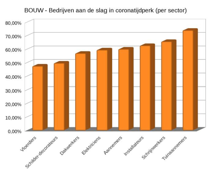 De activiteiten binnen de bouw lopen sterk uiteen afhankelijk van de werken die ze uitvoeren. Zo constateren we dat 74% van de tuinaannemers nog aan de slag zijn. Ook andere bouwvakkers die buiten aan de slag kunnen zoals schrijnwerkers en aannemers, leggen voorlopig het werk niet neer. Het zijn vooral de beroepen zoals schilders en vloerders die meer bij de klanten thuis werken, waar de activiteitsgraad daalt tot ongeveer 50%.