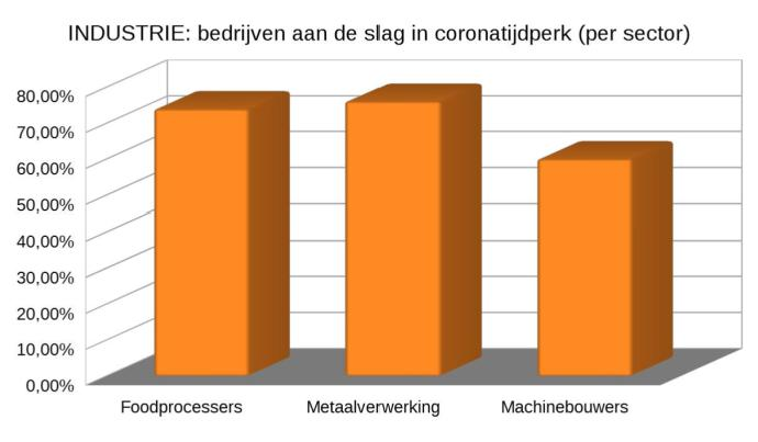 De bedrijven in de industrie lijden qua tewerkstelling minder onder de coronacrisis. Zo blijft 74% van de voedingsverwerkende bedrijven en 76% van de metaalverwerkende bedrijven produceren. Van de machinebouwers is nog 60% van de bedrijven aan het werk.